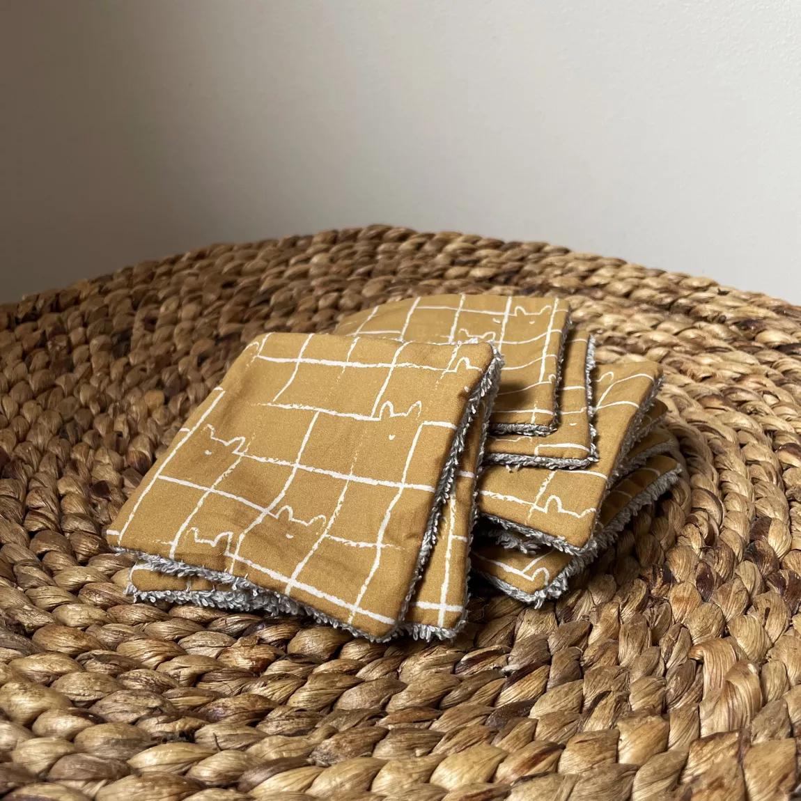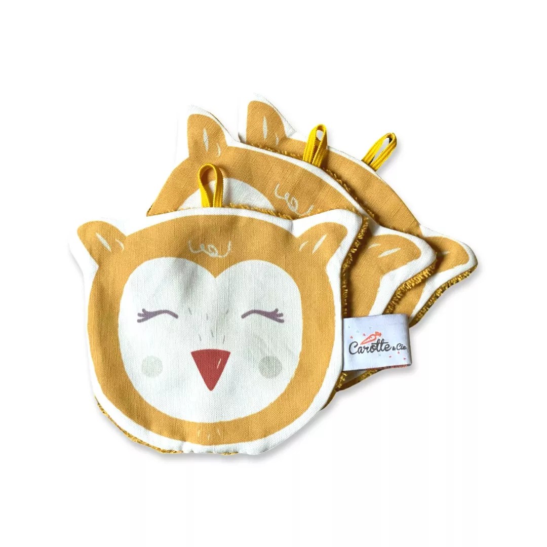 Lot de 3 grandes lingettes lavables Hibou moutarde