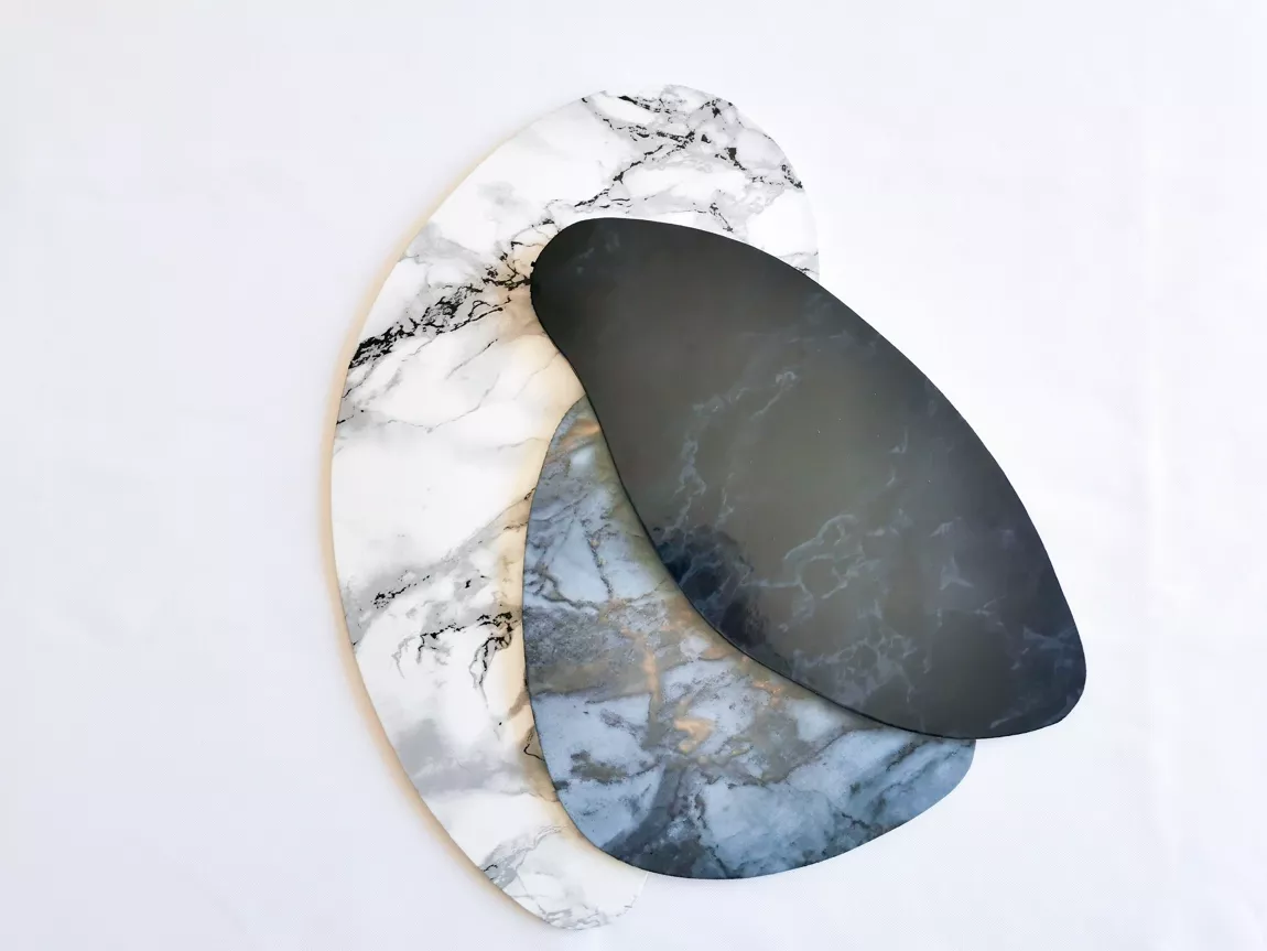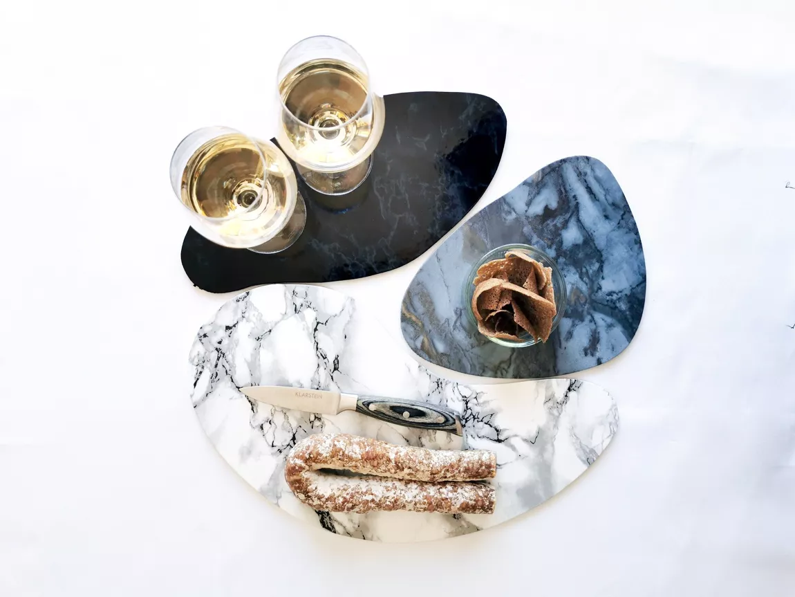 - Caractéristiques : Fait main et fabriqué en France Structure en carton bois, recouvert de vinyle PVC HQ alimentaire. Vinyles présents: marbre blanc, noir et Roméo (gris aux reflets dorés). Patins silicone anti-dérapants sous chaque assiettes.