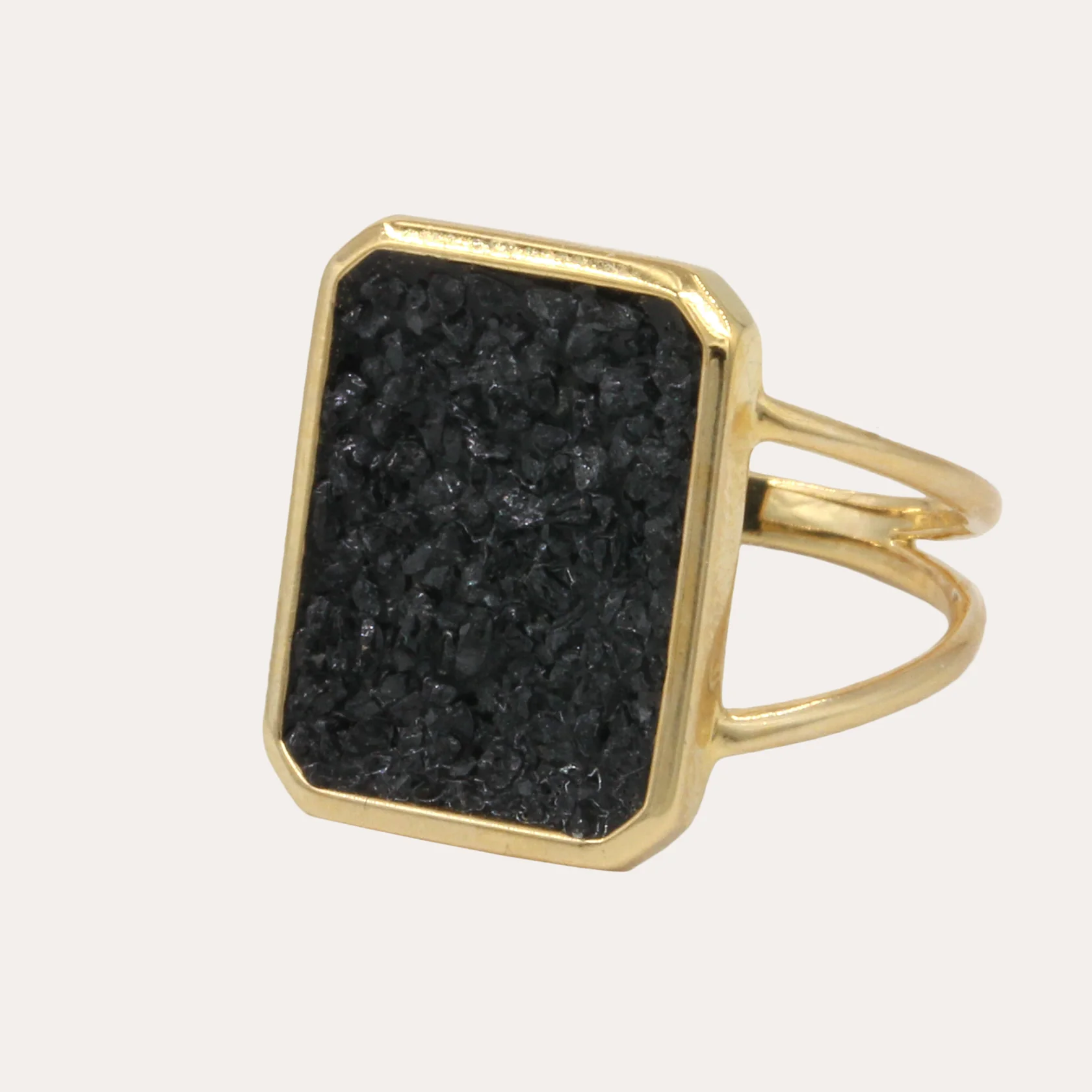 Bague rectangle en plaqué or, résine, incrustation de pyrite, tourmaline noire.