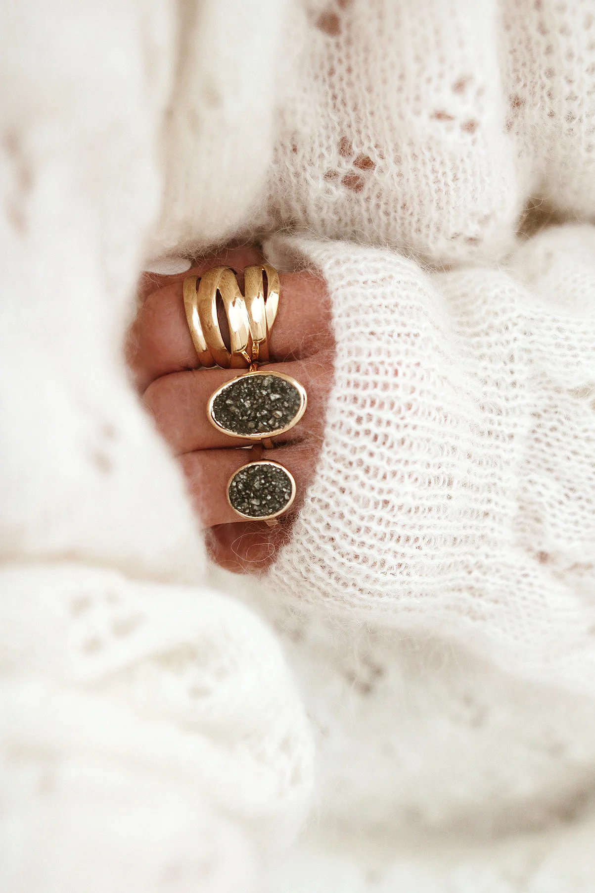 Bague en plaqué or, incrustation de pyrite tourmaline noire.