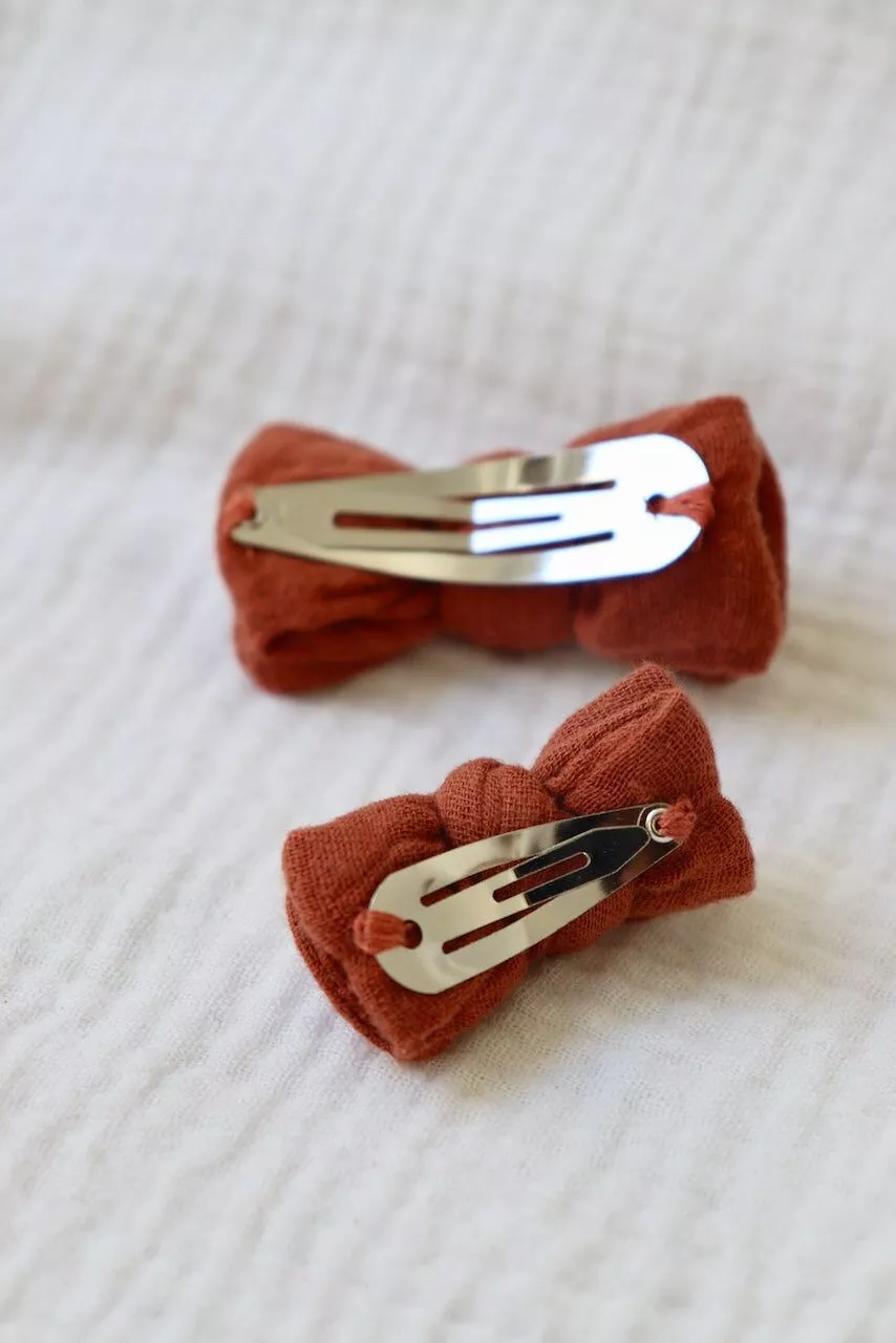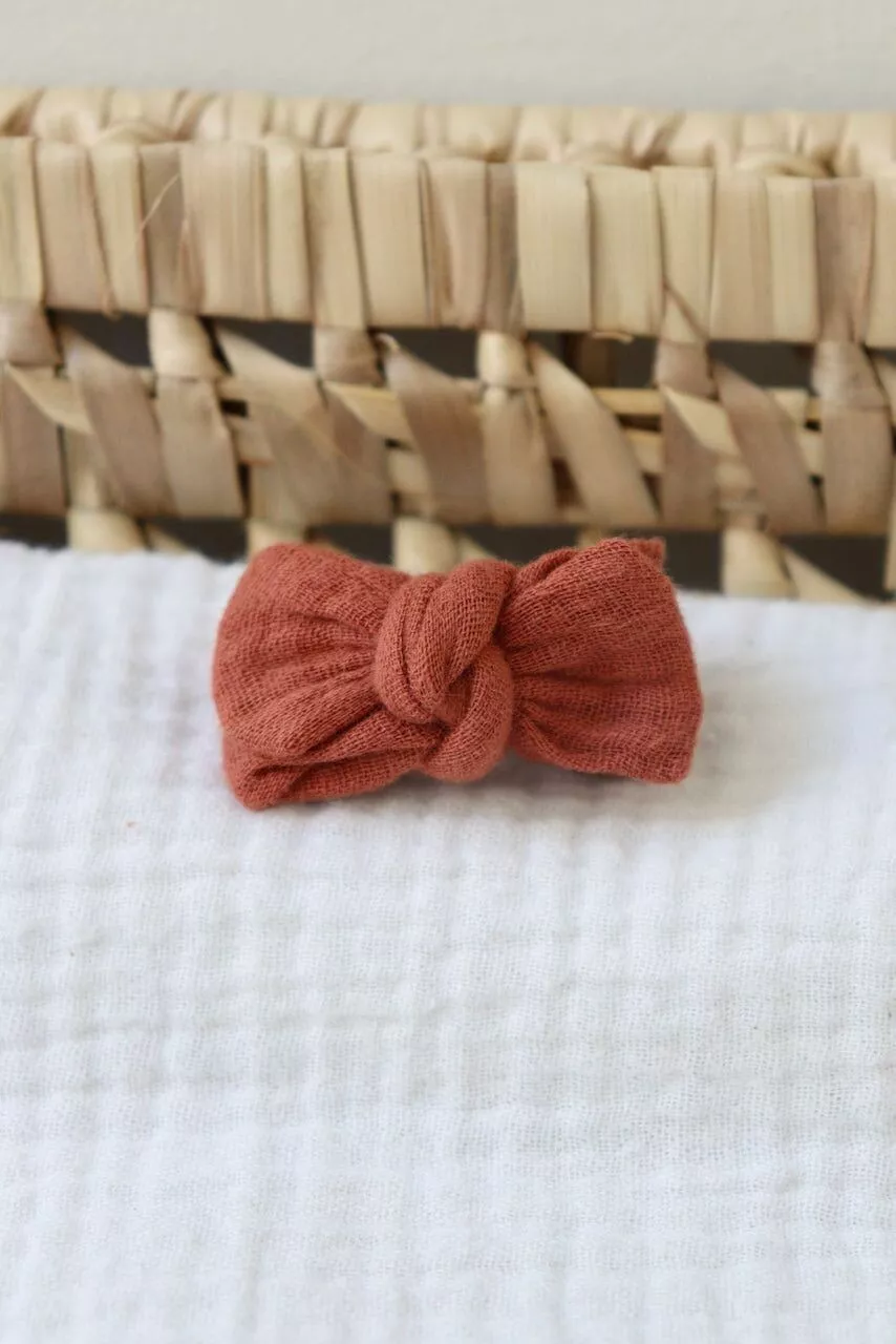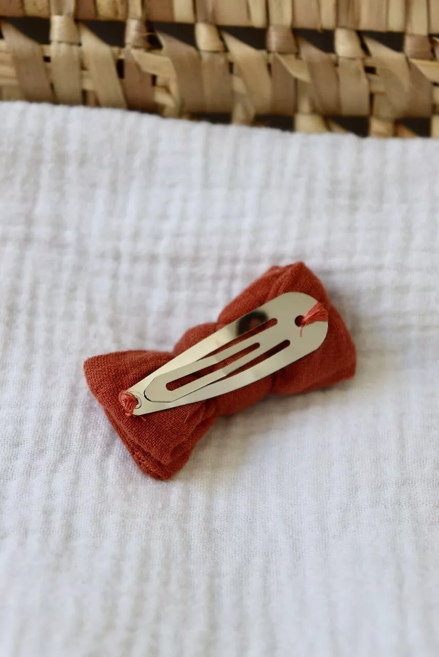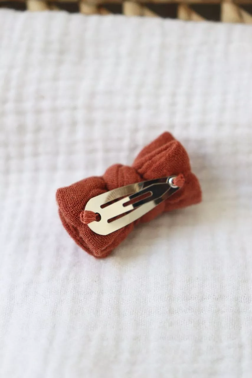 Coloris: Barrette argentée avec noeud en gaze tomette.
