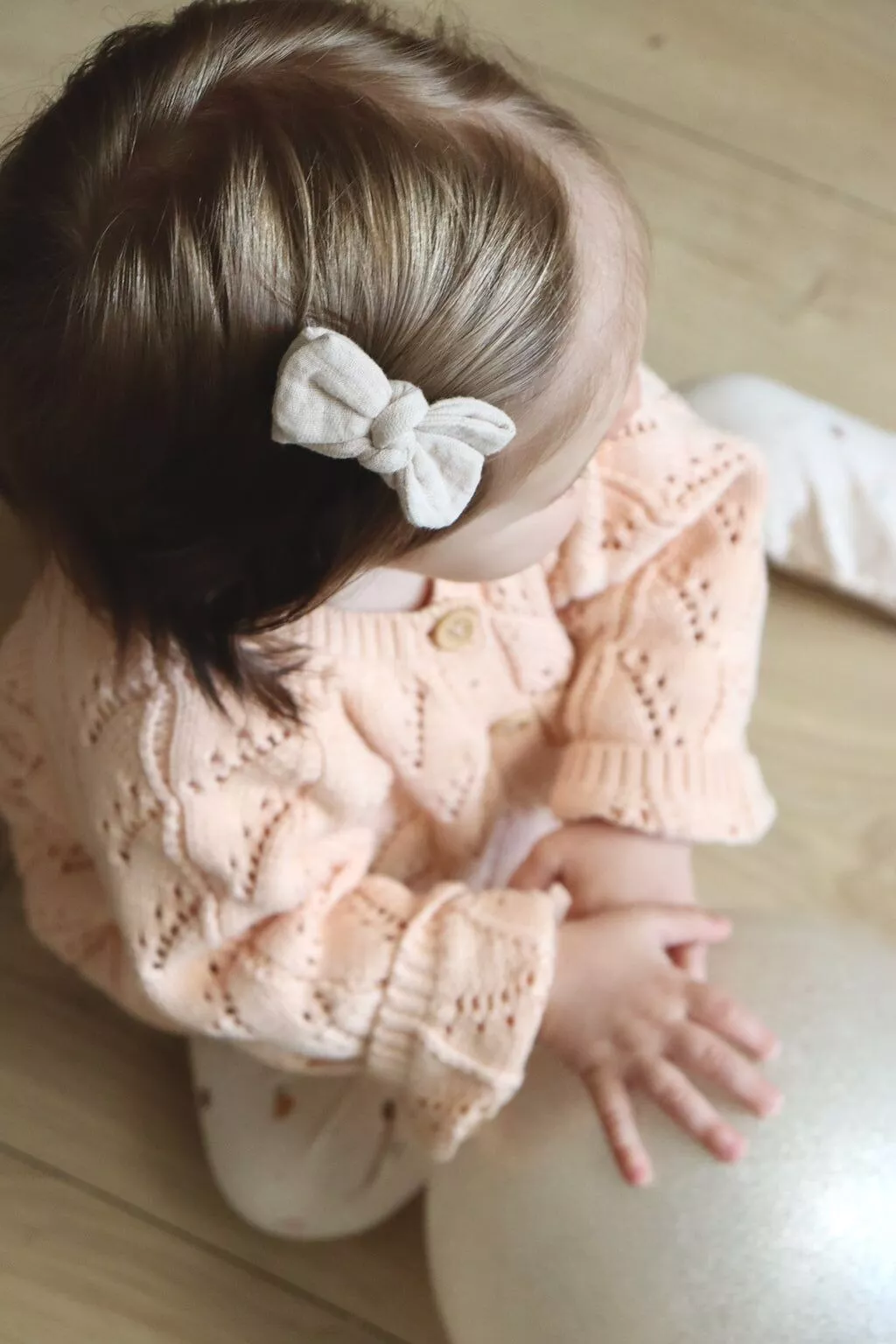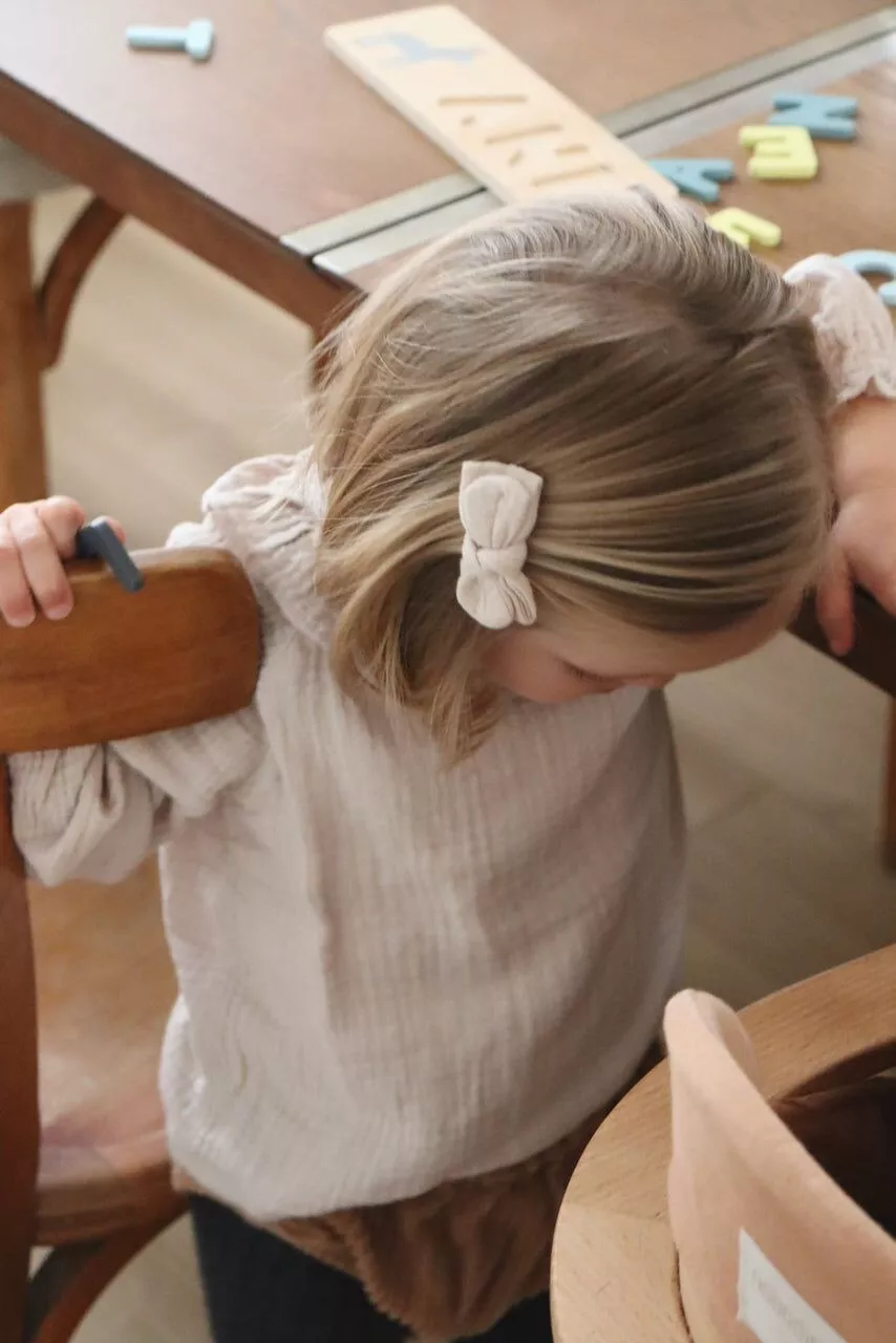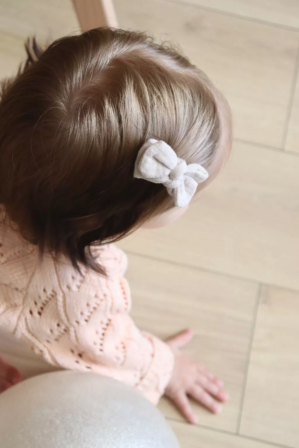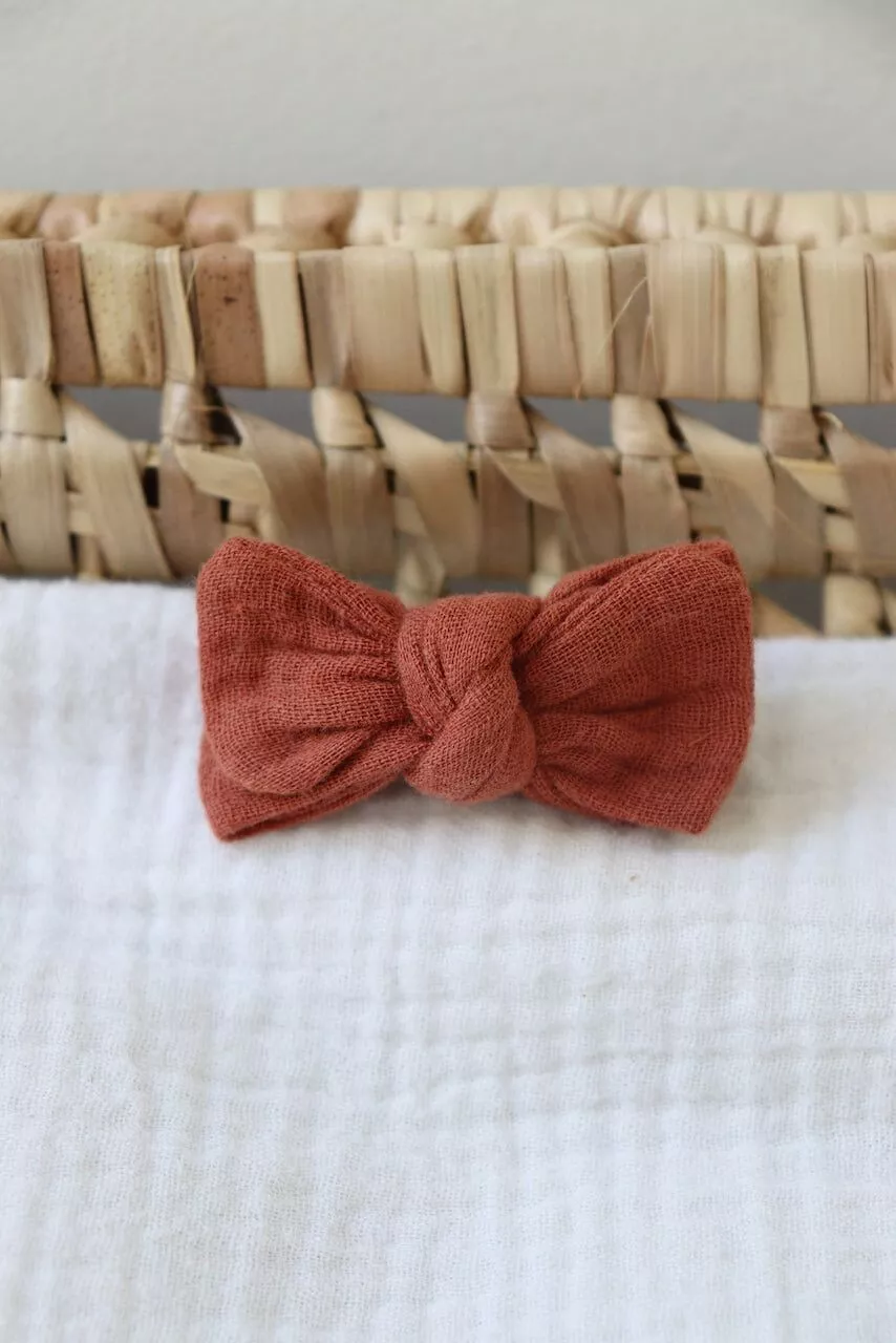 Coloris: Barrette argentée avec noeud en gaze tomette.
