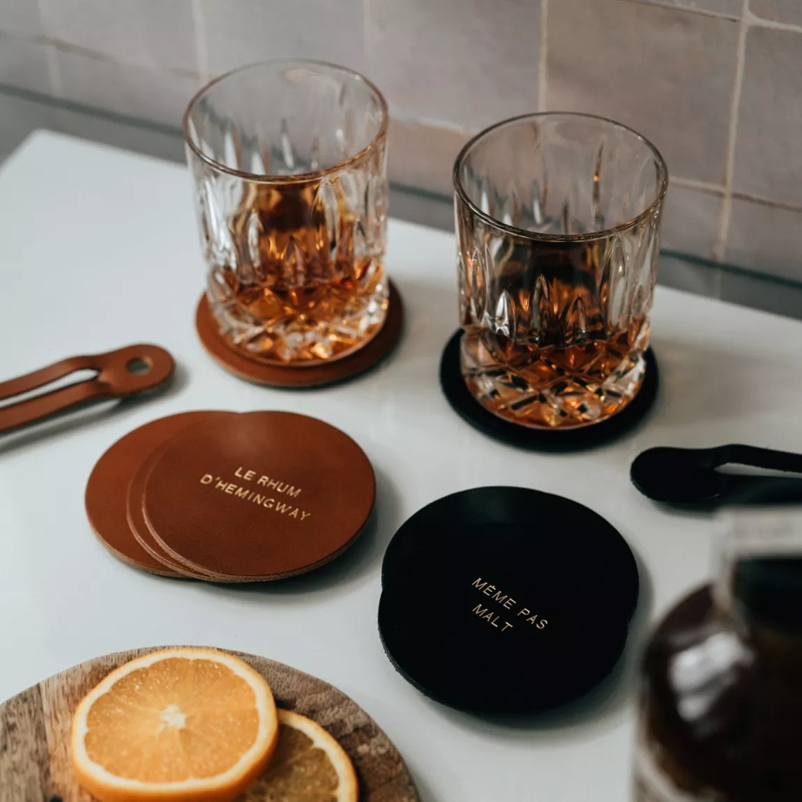 Un set de 4 dessous de verres en cuir au tannage végétal, gravés d’un message doré. Fabriqué en France.