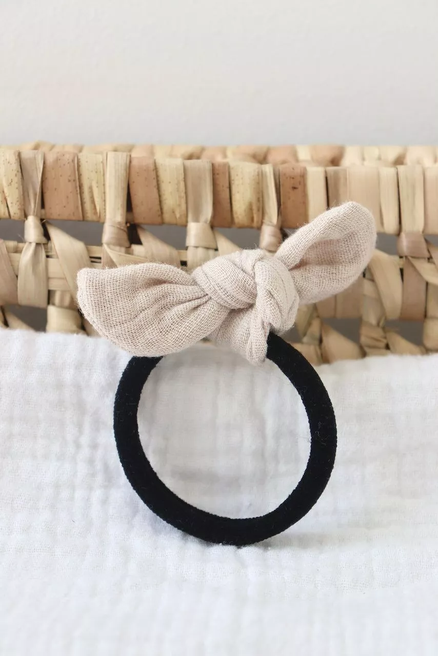 On adore le porter au poignet quand on ne l’a pas sur la tête mais aussi son élastique qui n’abîme pas les cheveux.