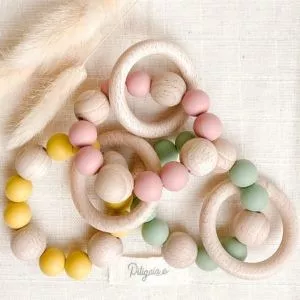Le hochet de dentition se compose de perles en silicone (innocuité testée en laboratoire français) et en bois de hêtre naturel et non traité. Les perles et l’anneau en bois sont issus de forêt durablement gérées et contrôlées.