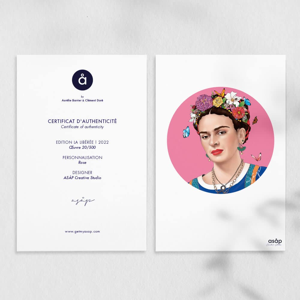 Illustration de Frida Kahlo pionnière du féminisme “La liberté”, il est disponible au format 30x40cm avec certificat pour une édition limitée de 500 exemplaires. Citation :” Nada hay absoluto. Todo se cambia, todo se muere, todo revoluciona. Todo vuela y se va. Pinto flores para que así no mueran. “
