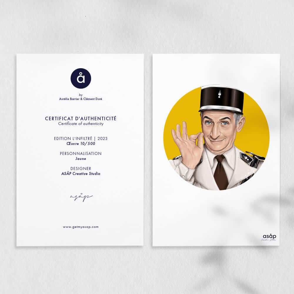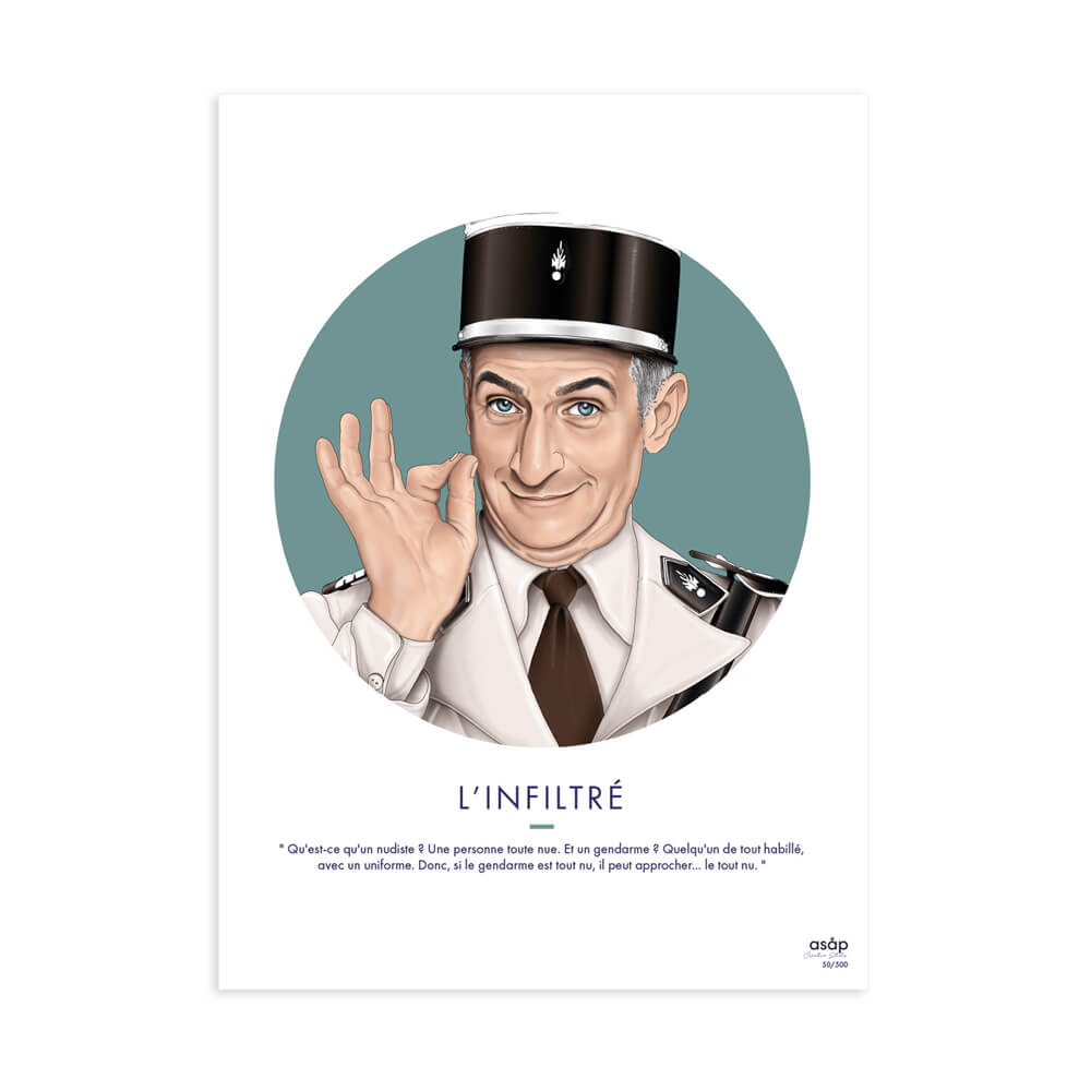 Illustration de Ludovic Cruchot (Louis de Funès) “L’infiltré”, il est disponible au format 30x40cm avec certificat pour une édition limitée de 500 exemplaires. Citation :” Qu’est-ce qu’un nudiste ? Une personne toute nue. Et un gendarme? Quelqu’un de tout habillé, avec un uniforme. Donc, si le gendarme est tout nu, il peut approcher… le tout nu. “