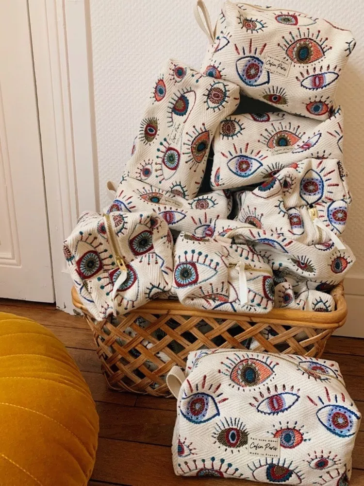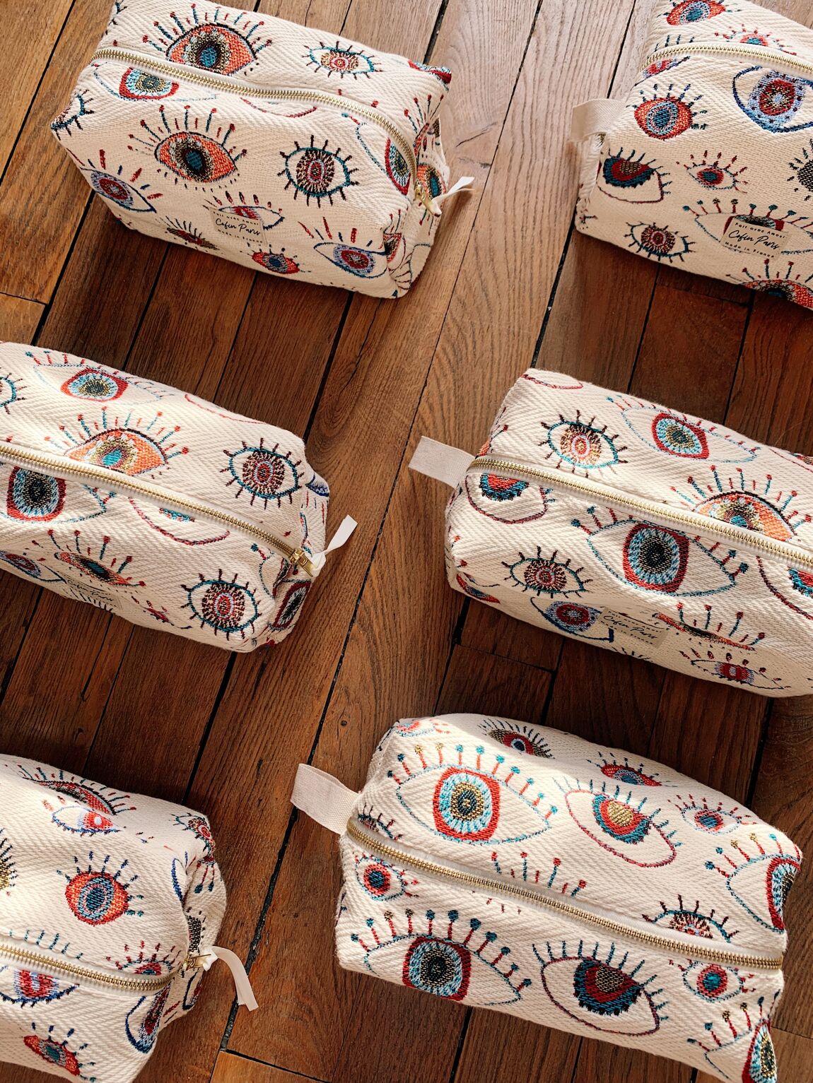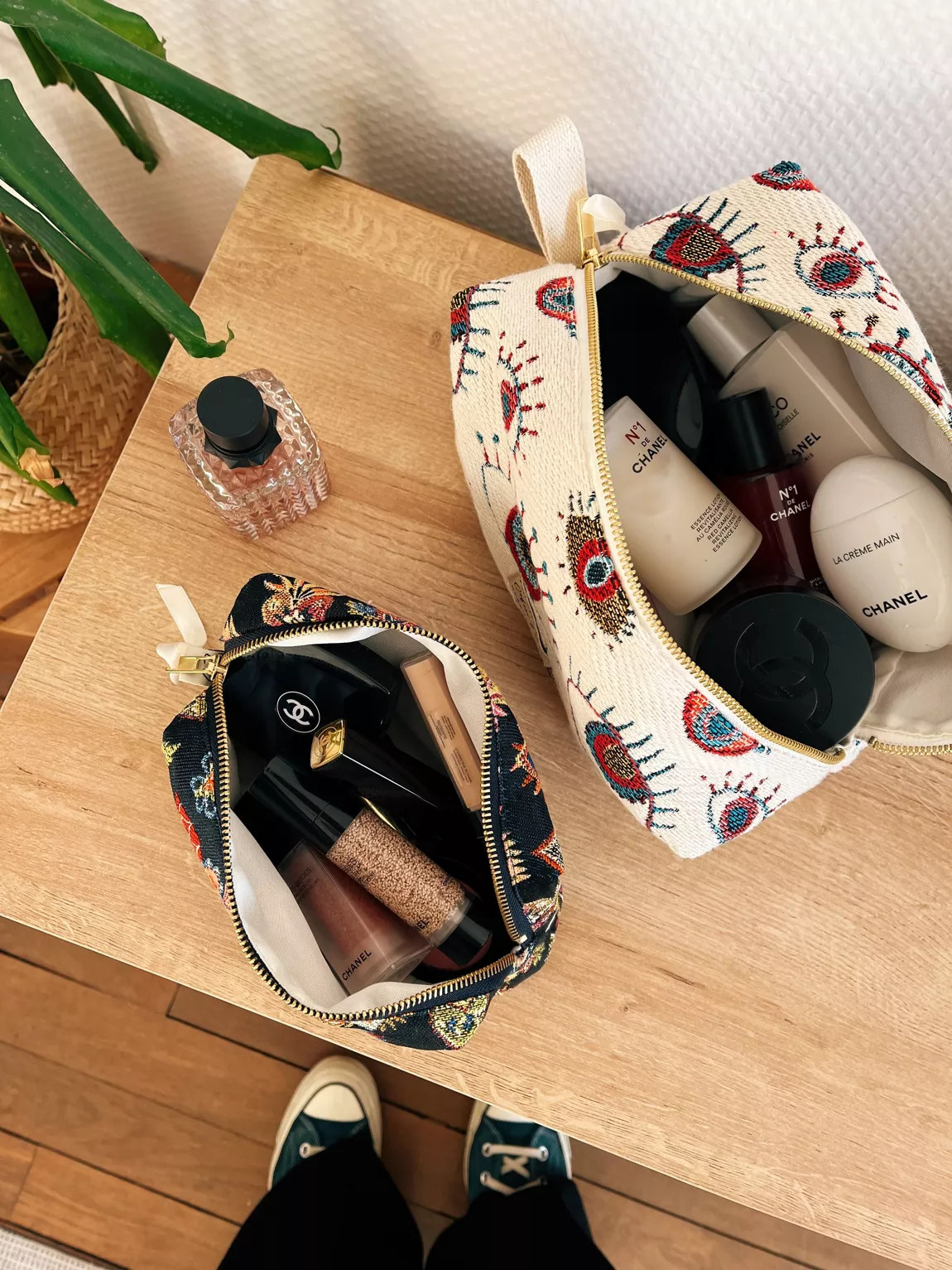 Grande trousse de toilette qui peut contenir tout votre nécessaire de toilette pour courts ou longs séjours. Tissu jacquard tissé et brodé en France aux fils lurex . – Cofin Paris